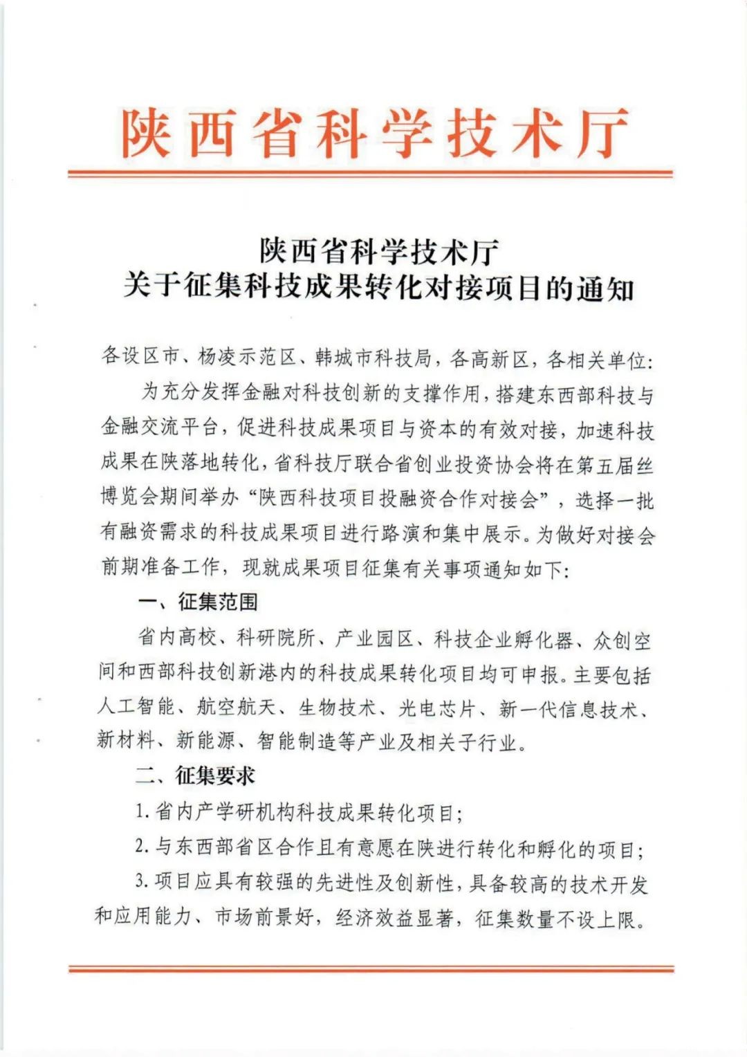 【协会通知】陕西省科技厅关于征集科技成果转化对接项目的通知